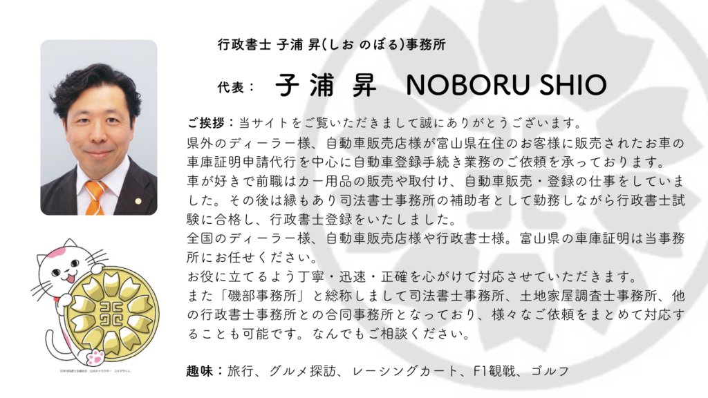 事務所名 行政書士子浦昇事務所 代表 子浦 昇(しお のぼる)